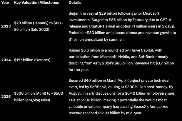 OpenAI’s valuation has soared. From $29 Billion in 2023 to its valuation this week of $500 Billion making it the most valuable privately held company ever.