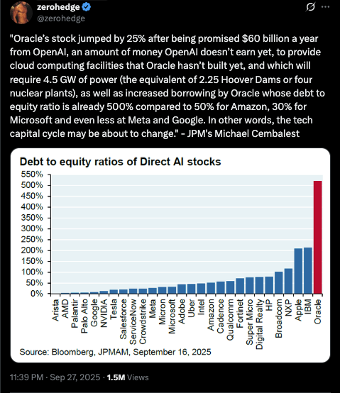 “Oracle’s stock jumped by 25% after being promised $60 billion a year from OpenAI, an amount of money OpenAI doesn’t earn yet, to provide cloud computing facilities that Oracle hasn’t built yet, and which will require 4.5 GW of power (the equivalent of 2.25 Hoover Dams or four nuclear plants), as well as increased borrowing by Oracle whose debt to equity ratio is already 500% compared to 50% for Amazon, 30% for Microsoft and even less at Meta and Google.